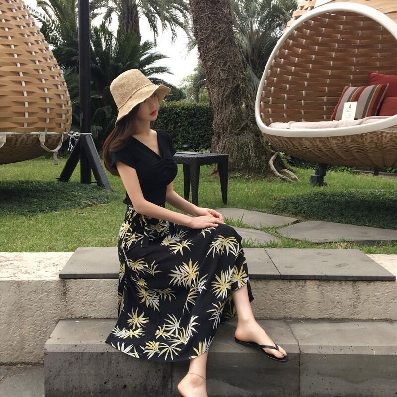 バカンスやリゾートにもピッタリ♪VネックねじりTシャツ×総柄ラップスカートのセットアップ☆