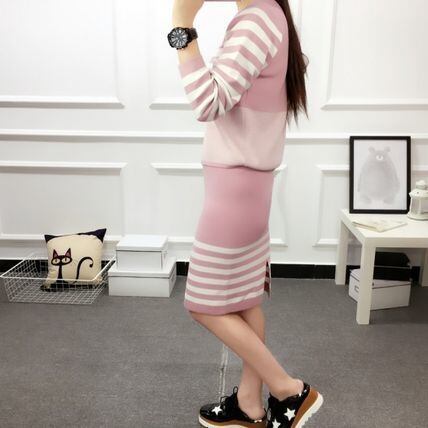 秋冬 韓国 長袖 セーター ニット 膝丈 ミディアム セットアップ